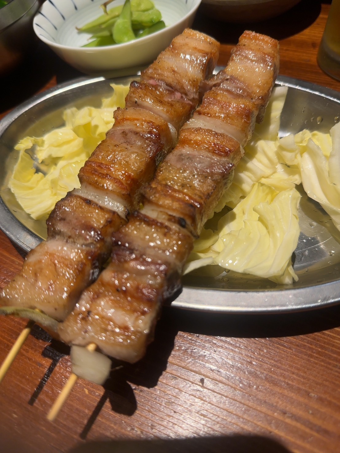 私のお勧めは、この豚バラ串と定番の餃子です。