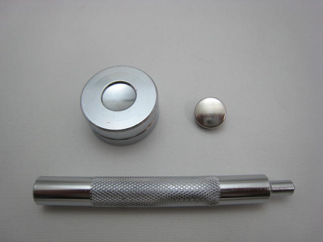 7050ホック専用の手打ちタイプの取付器です。打ち棒と皿のセットで、木槌やプラハンマー等で叩いてカシメます。※金属ハンマーは使用しないでください。手打器はメーカーにより形状が異なりますのでご注意下さい。