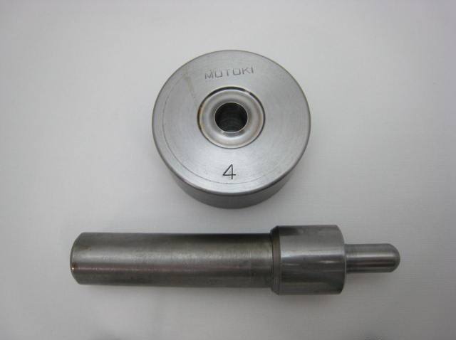 4グロメット専用の手打ちタイプの取付器です。打ち棒と皿のセットで、木槌やプラハンマー等で叩いて取付けます。※金属ハンマーは使用しないでください。手打器はグロメットのメーカーにより形状が異なりますのでご注意下さい。