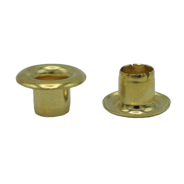 4mm穴の足割れタイプのハトメです。腕章の紐や安全ピンの通し穴等の補強金具として使用されてます。真鍮製のため錆びにくいです。座が付いておらず、足が四方に割れてかしまりますので、直接肌に触れる箇所への取付は避けてください。