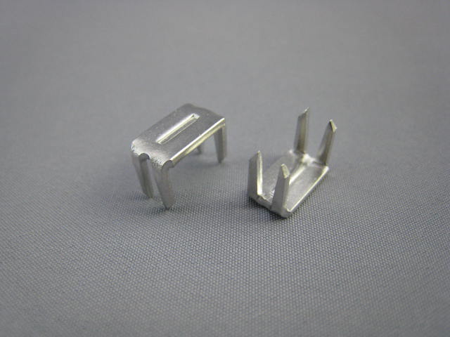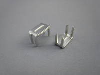 10番ファスナー用の四ツ足の金具です。 四ツ足になっており、エレメント部分を挟み込むようにテープに差込み、スライダーが抜けなくするために取り付ける金具です。 下止めはコイル・ビスロン共通で使用出来ます。