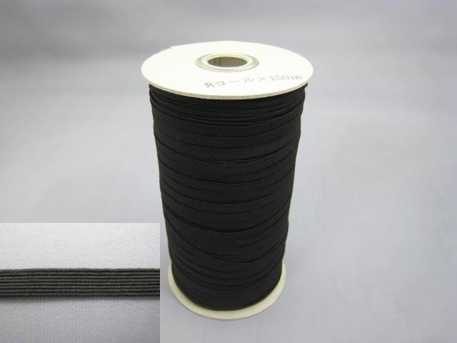 製紐機で、ゴム糸を芯にして、回りを糸で組んでいるゴムテープです。素材はスフと天然ゴムです。表面は、スフの短繊維の綿状のものが見えます。強力タイプに比べゴム糸がより細く強度が弱くなります。