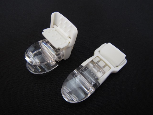 ワンタッチで装着できる縫製不要タイプのフィッシュクリップです。縫製不要の為、コストダウンとスピードアップに繋がります。対応紐幅は平紐15mm(厚み1.6mm)程度までです。オール樹脂製で金属を使用しておりません。検針器対応です。必ず紐はヒートカットしてから装着して下さい。加工時にフタが完全にはまっている事をご確認下さい。